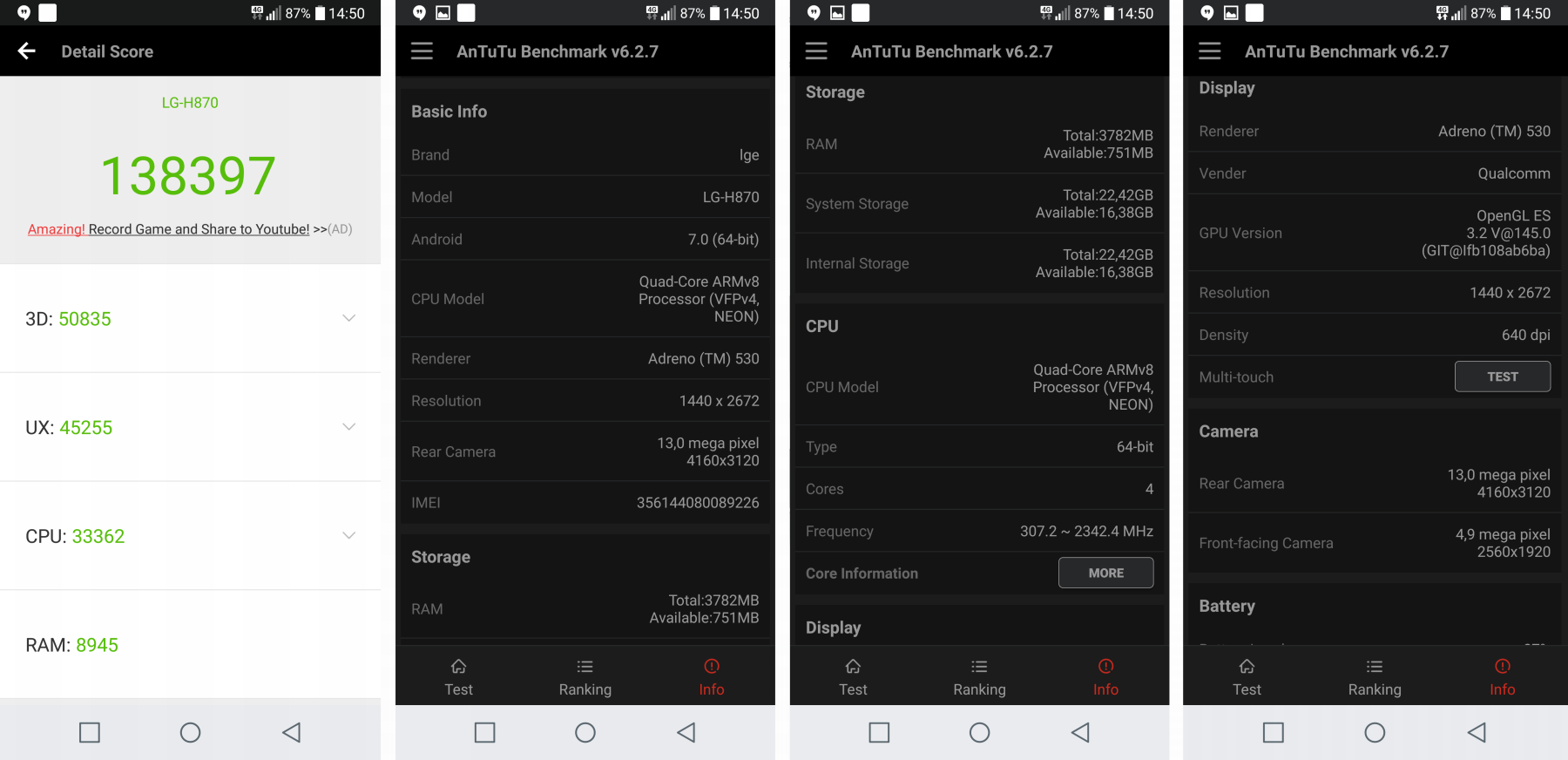 U radu je LG G6 u većini situacija vrlo brz, rijetko kad ćemo primijetiti neki lagani lag, zastajkivanje, ali bismo rekli da se radi o nesrazmjeru rezolucije ekrana i same aplikacije pa predlažemo da se s pojedinim aplikacijama za koje primijetite da imaju lagano zastajkivanje malo pozabavite i promijenite im rezoluciju. Mi smo se poigrali i dobili smo dobar rezultat. Na AnTuTu testu LG G6 je osvojio 138.397 bodova.