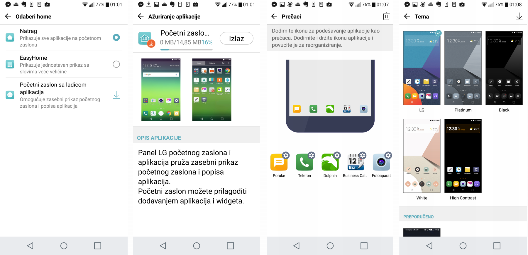 Sam popis aplikacija može biti prikazan na tri različita načina – možemo imati standardni popis svih aplikacija (s tipkom izbornika na dnu ekrana), EasyHome također ima početnu tipku izbornika ali povećava veličinu prikazanih aplikacija na ekranu. Treći način Početni nema standardnog popisa svih aplikacija nego su sve instalirane aplikacije postavljene na početne ekrane.