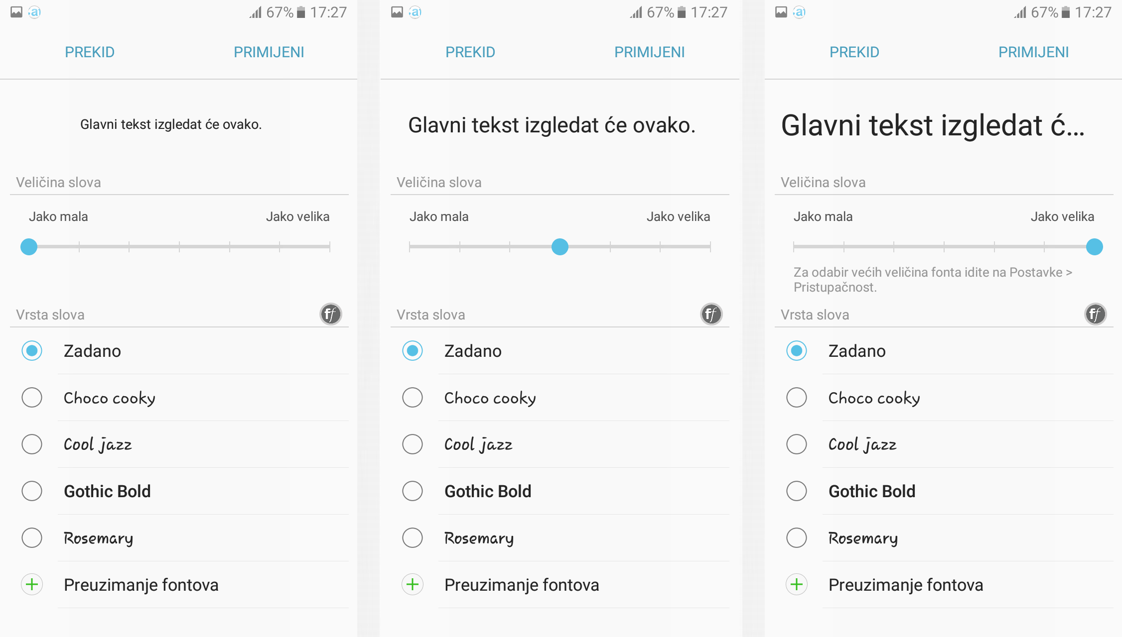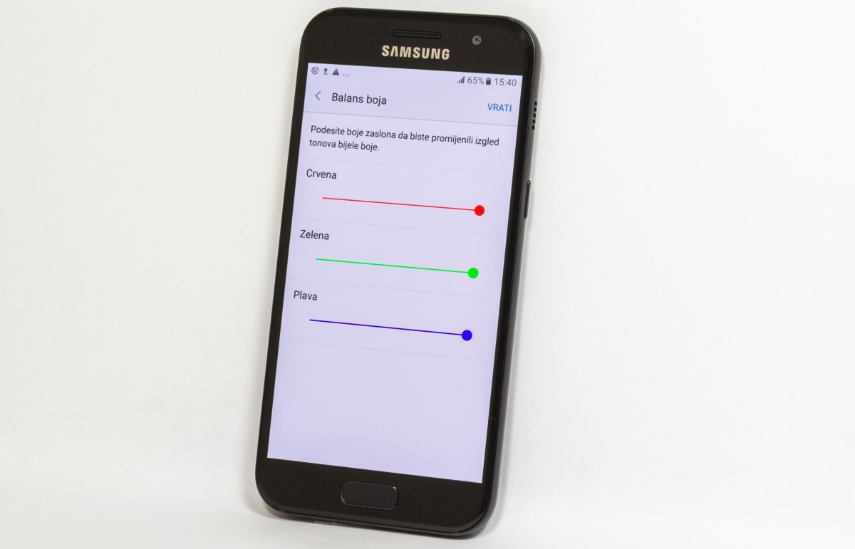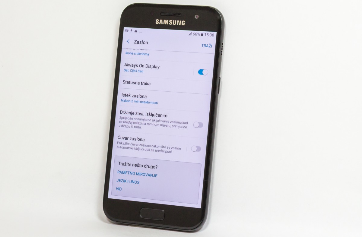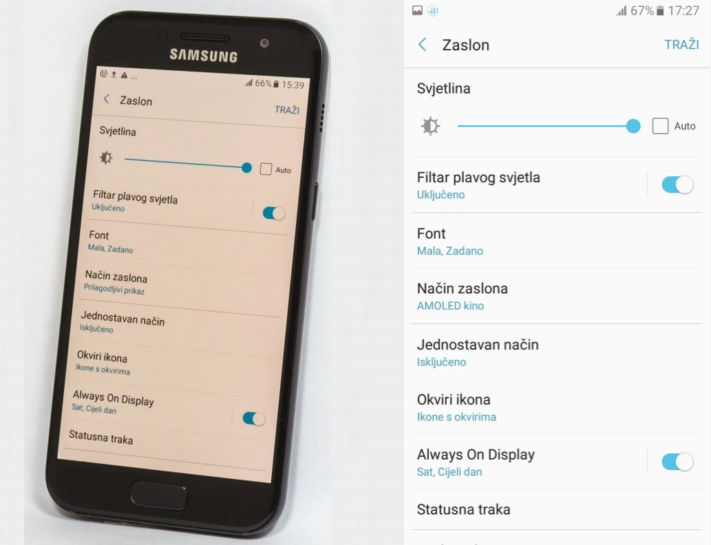 Možete odabrati automatsko podešavanje svjetline u odnosu na okolinu, navečer se može uključiti filtar plavog svjetla kako biste ugodnije mogli zaspati nakon korištenja telefona, zgodno je što se u postavkama može podesiti veličina teksta kako baš vama odgovara kroz šest veličina, imate priliku postaviti svoj omiljeni font, na ekranu ikone mogu biti jednostavnije ili s okvirima pa je nešto izbornik u tom slučaju šareniji. Ipak, ono što je naročito zgodno kod testiranog Samsung Galaxy A3 (2017) jeste Always On Display koji će uz minimalnu potrošnju cijelo vrijeme prikazivati vrijeme i obavijesti ako postoje pa kad god pogledate u telefon odmah znate što se novo događa, bez da pokrećete osvjetljenje na cijelom ekranu.