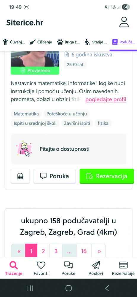 Živimo u užurbanom vremenu i kad-tad će se dogoditi da zatrebamo pomoć s našim najmilijima. Pronaći pomoć ponekad nije lak zadatak. Servis siterice je počeo kao centralno mjesto gdje možemo pronaći privremenu dadilju za dijete, gdje provjerene „siterice“ imaju oglašeno područje rada, cijenu, kratak osobni opis, ocjenu i recenzije drugih korisnika. U međuvremenu je servis proširio uslugu i na druge osobne usluge, kao što su briga za starije osobe i kućne ljubimce, čišćenje kućanstva i instrukcije iz raznih školskih predmeta za mlade. Sve usluge možete pretraživati putem brojnih filtera, a želite li brže pronaći željeni kontakt, možete sami objaviti oglas za posao s opisom, budžetom i brojnim drugim željenim parametrima i uvjetima. Važno je napomenuti da su usluge čuvanja i čišćenja pokrivene SitericeProtect osiguranjem, a plaćanje usluga se vrši isključivo sigurnosnim protokolom putem aplikacije. |